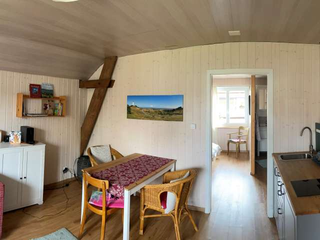 In Romanshorn erwartet Sie in einem ruhigen Quartier, in einem von wildem Wein umrankten Nebengebäude, eine 2-Zimmer Gästewohnung. Bahnhof, Hafen, Supermarkt so wie die Seepromenade sind in ca. 5 Gehminuten zu erreichen.