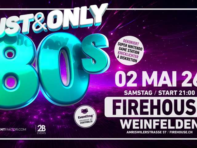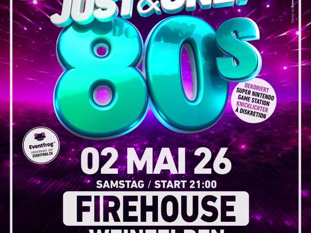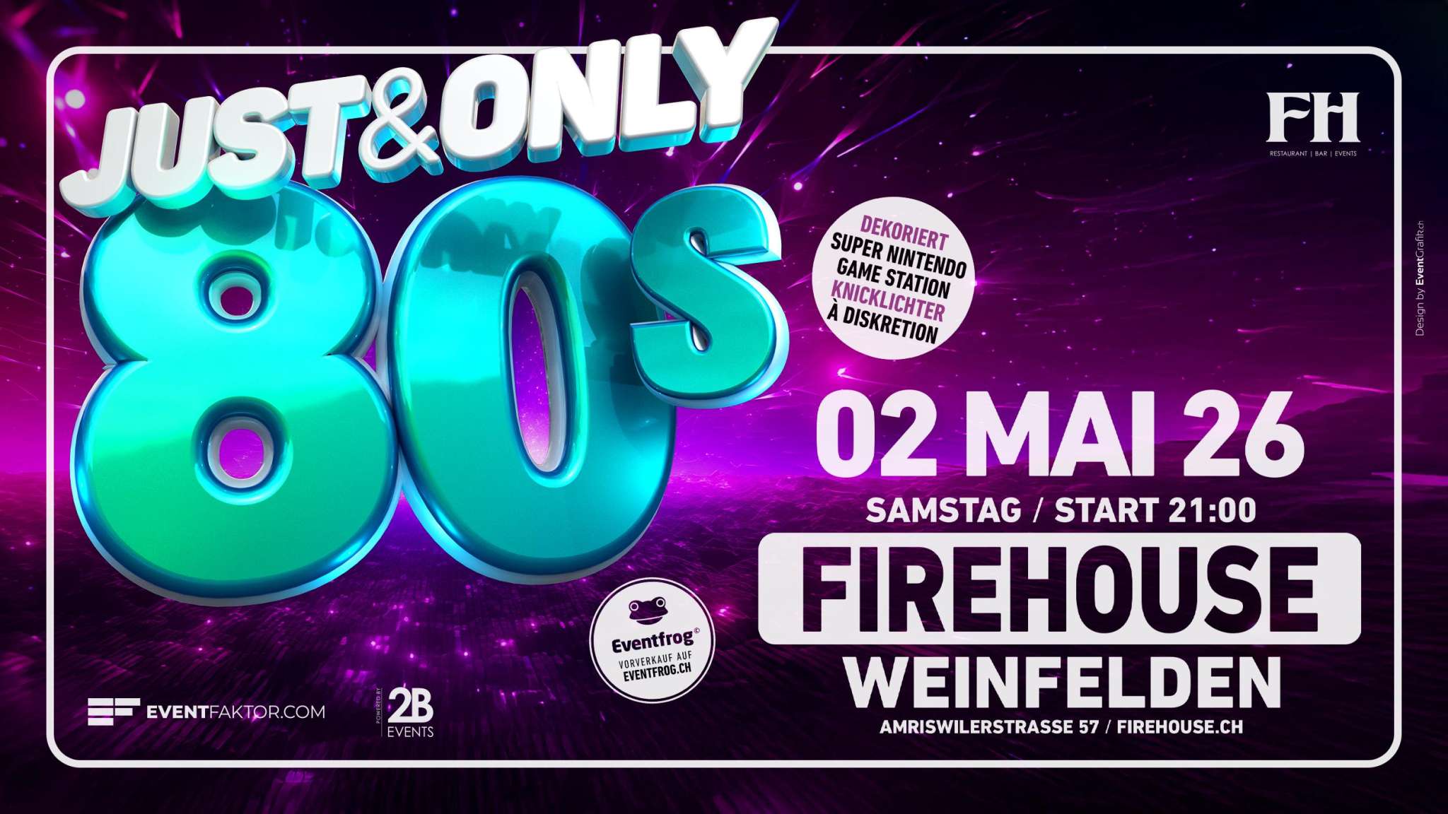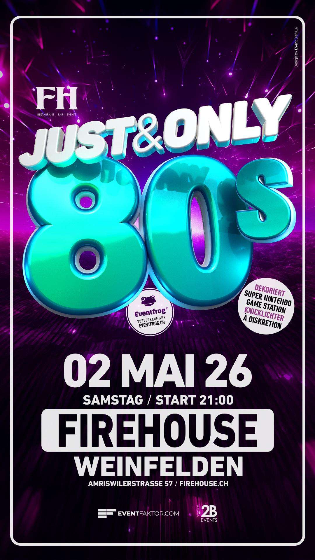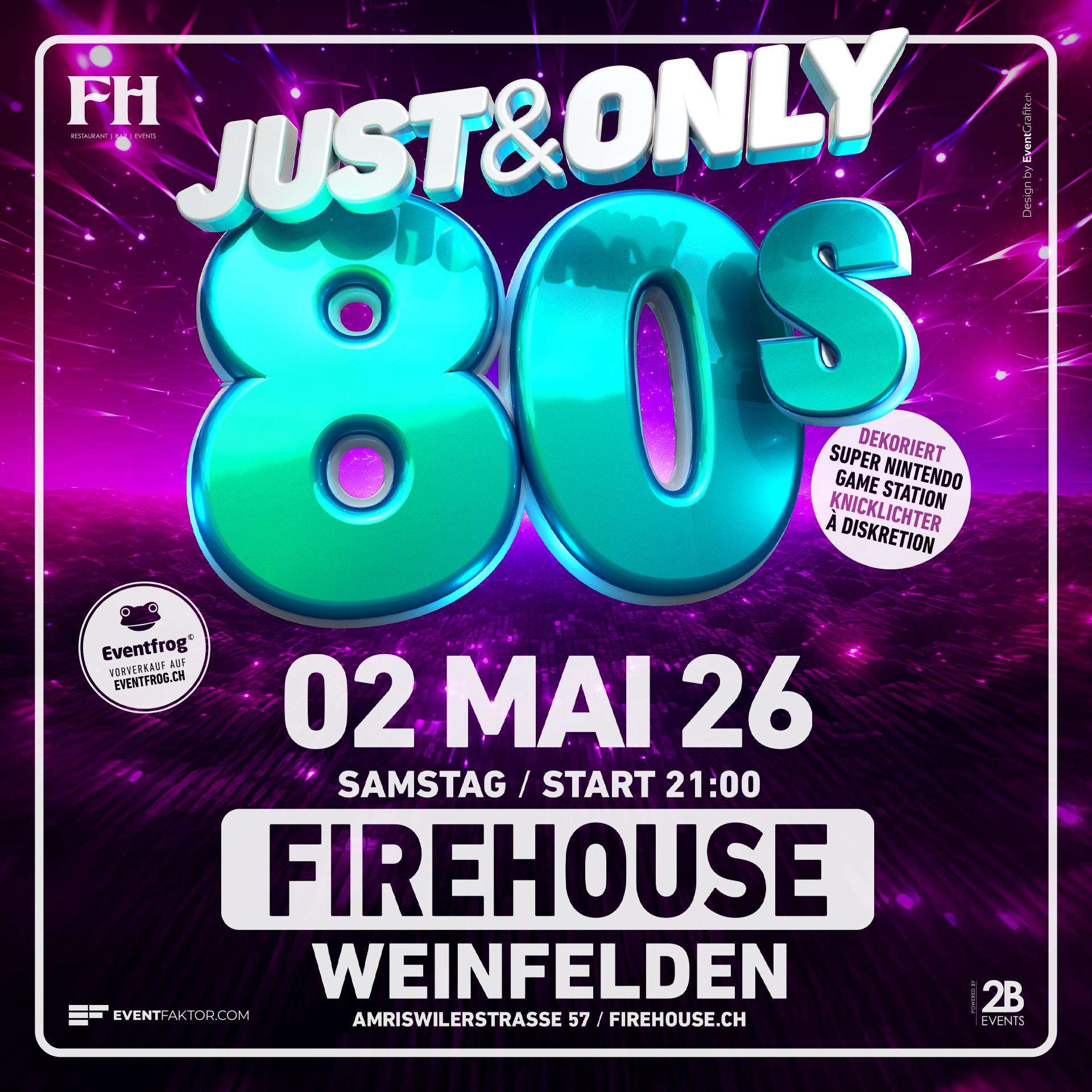 Die JUST & ONLY 80’s kommt am Samstag, 2. Mai 2026 zurück ins Firehouse Weinfelden und bringt die unvergessliche Magie der Achtziger erneut auf die Tanzfläche! ✨