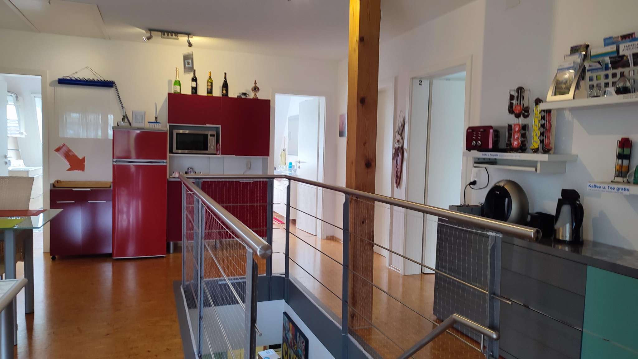 Alle Räume umgeben die offene Galerie (28qm), die als Frühstücks- und Gemeinschaftsraum ausgelegt ist. Von hier aus kommt man auch auf den sehr grossen Balkon, beschattet mit einer Markise über die ganze Länge von 6,25 m. Die Unterkunft ist auch ideal für Kleingruppen, da alle Zimmer auf einer Etage liegen.