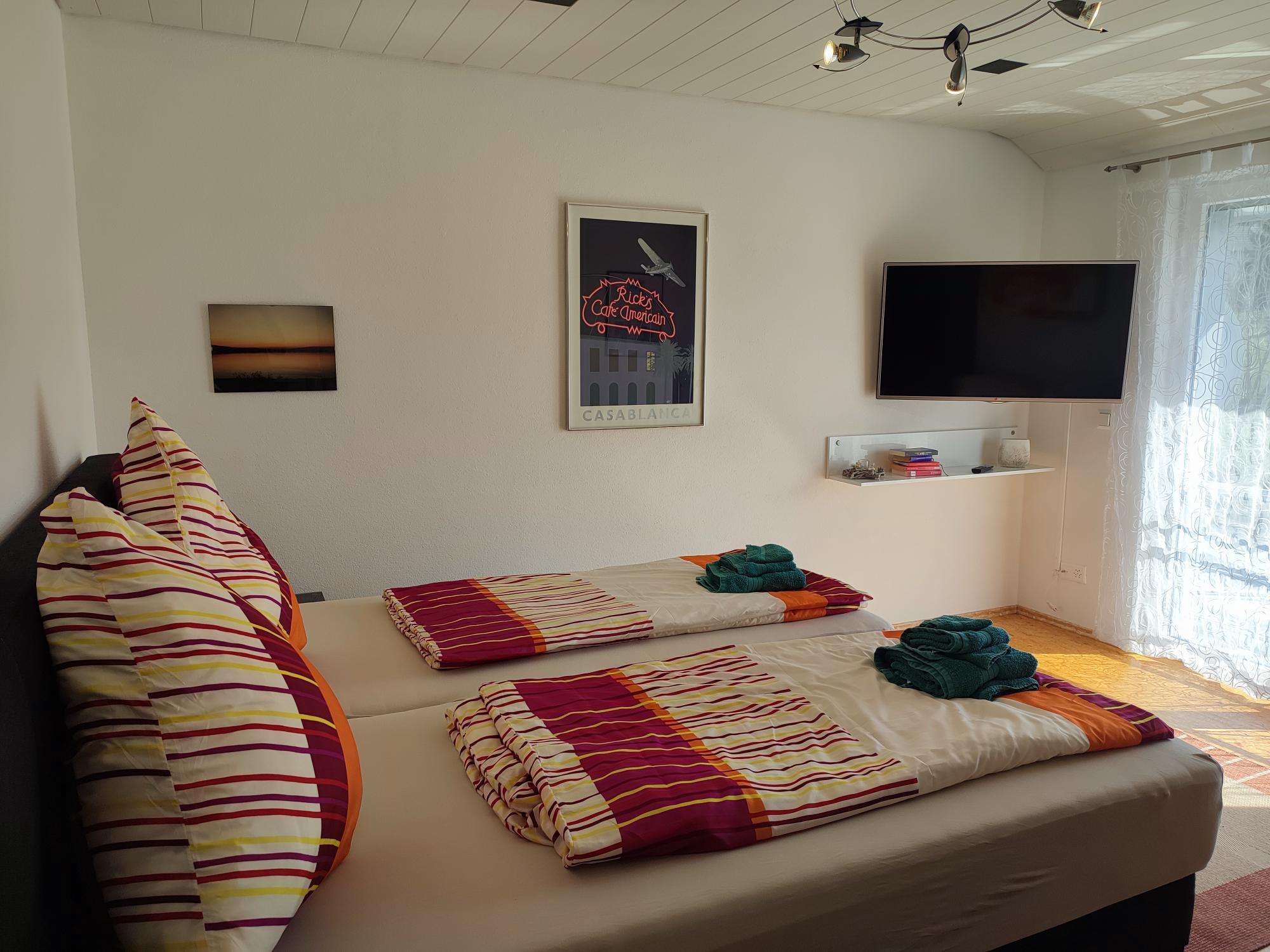 Vier moderne, grosse Doppelzimmer sind mit King-Size-Betten (alle 180 cm Breite), Schrank, einer kleinen Sitzgruppe und TV ausgestattet. Alle Räume haben Insektenschutzgitter und Verdunkelungsrollladen. WLAN steht gratis zur Verfügung. Die zwei Badezimmer, 1x mit Regendusche/WC und 1x mit Badewanne/Regendusche/WC, werden gemeinsam benützt.