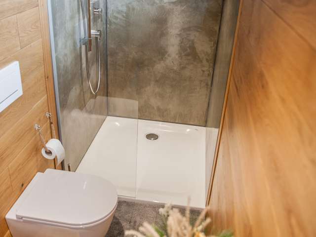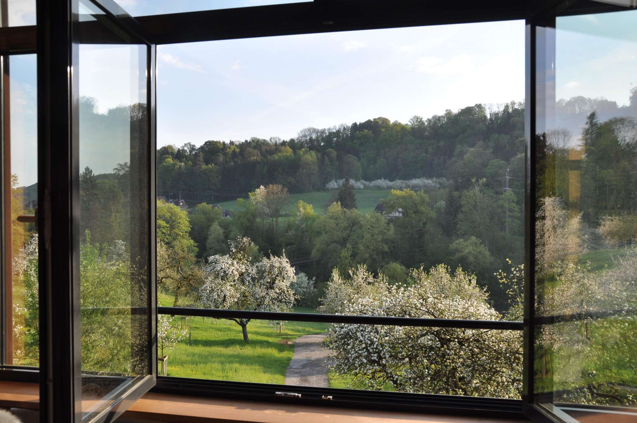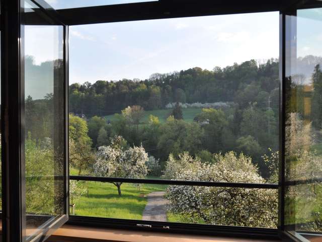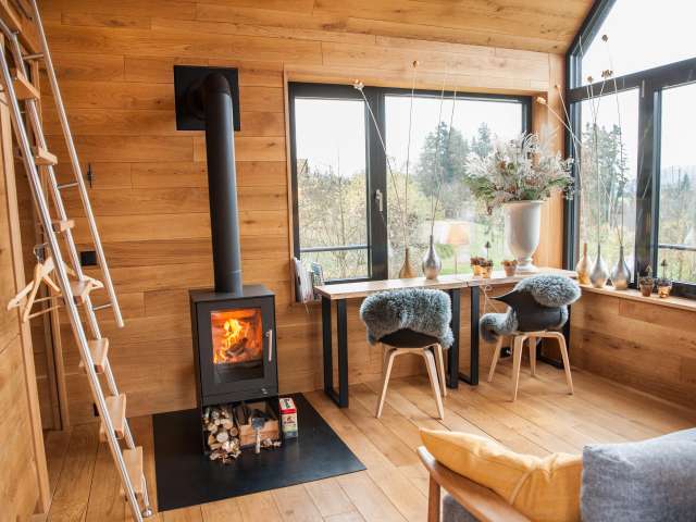 Der einzigartige Rückzugs-Ort in den Bäumen bietet eine wunderschöne Aussicht auf das Flusstal der Thur und die typischen alten Thurgauer Apfelbäume. Auf 23 m² findet man modernen Komfort und stilvoll-schlichtes Ambiente. Das Baumhaus ist mit allem Notwendigen ausgestattet: Dusche, WC, Doppelbett, kleine Küche mit Kühlschrank, Kaminofen und Terrasse.