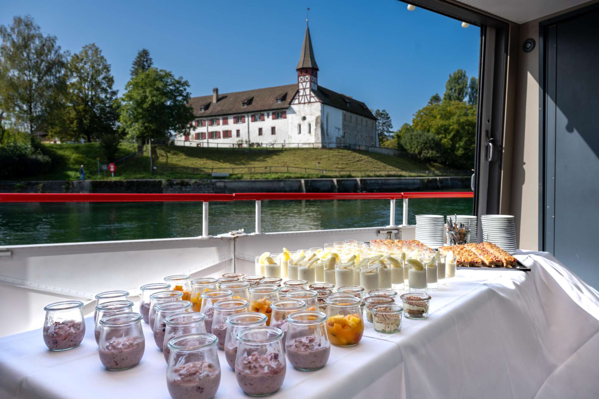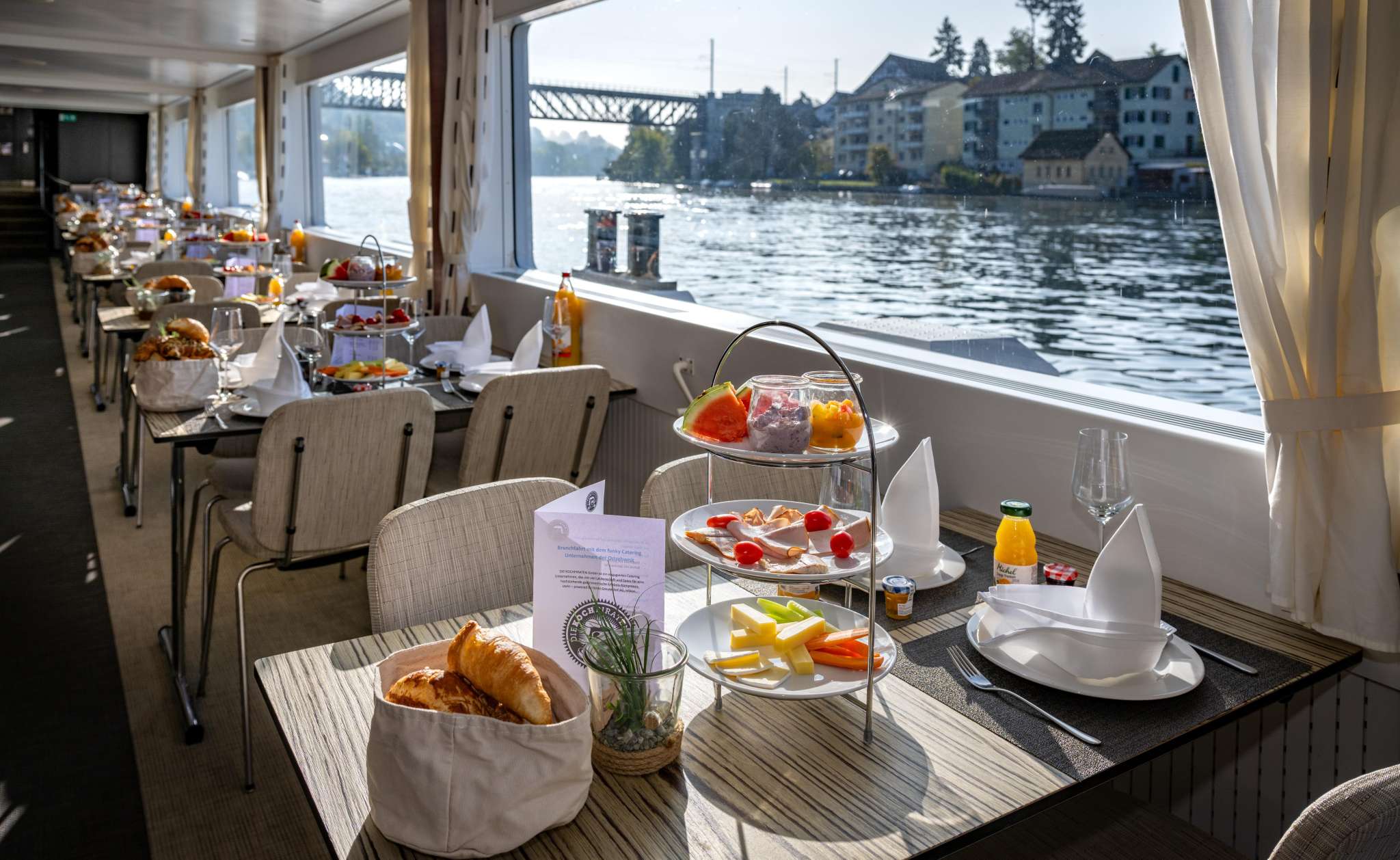 Genussprogramm an Bord. Entspannt an den Brunch-Köstlichkeiten erfreuen. Die variantenreiche Auswahl präsentieren wir Ihnen auf Etageren an ihrem Tisch.