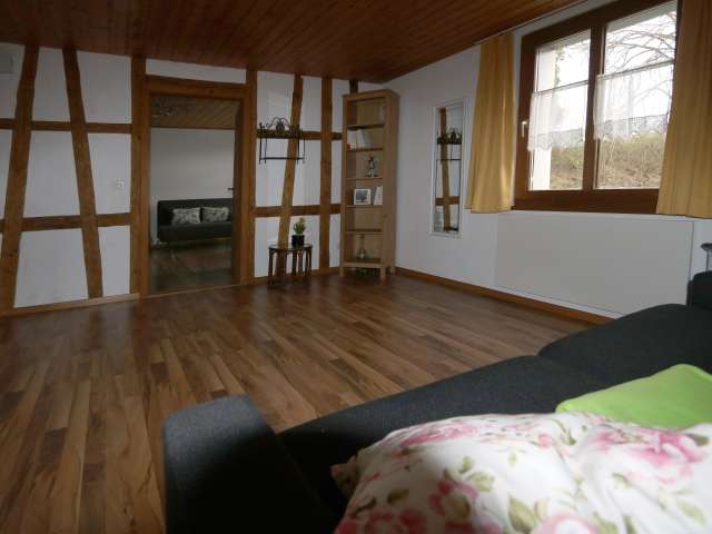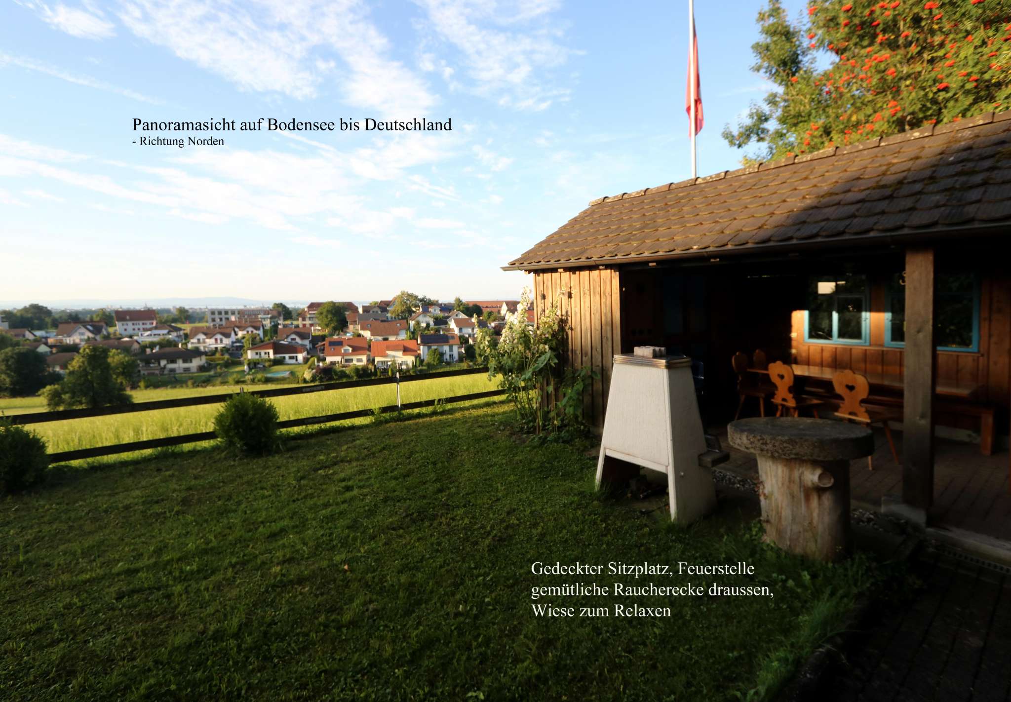 Die Wohnung liegt in einem ehemaligen Bauernhaus und ist teilweise original erhalten mit Riegelwand und Balken. Das Haus liegt in ländlicher Umgebung und bietet eine wundervolle Panoramasicht über den Bodensee.