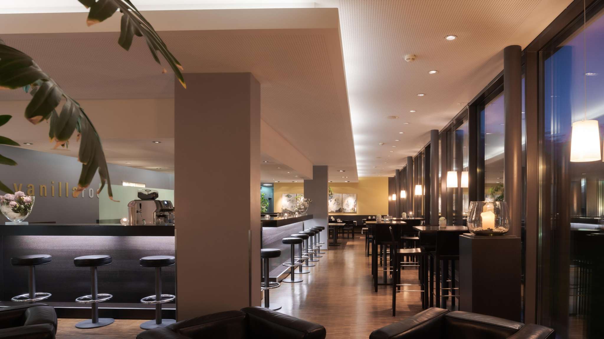 Der stilvolle Vanillaroom und die gedeckte Terrasse vor dem Haus sind ideale Rückzugs- und Entspannungsorte. Wo morgens das Frühstück serviert wird, verwandelt sich abends der Vanillaroom in eine Lounge mit Barbetrieb. Eine Karte mit ausgewählten Weinen, Cocktails und feinen, hausgemachten Snacks lädt zum Apéro oder geselligen Zusammensein ein. Für Spätanreisende werden warme Speisen bis Mitternacht angeboten.