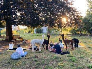 Jacqueline Baumann von Wurzelwege führt durch eine tolle Yogastunde mit Inputs für Ausgleich und Regeneration nach dem Training. Die Alpakas sind sehr fühlsame Tiere und werden die Regenration mitunterstützen.