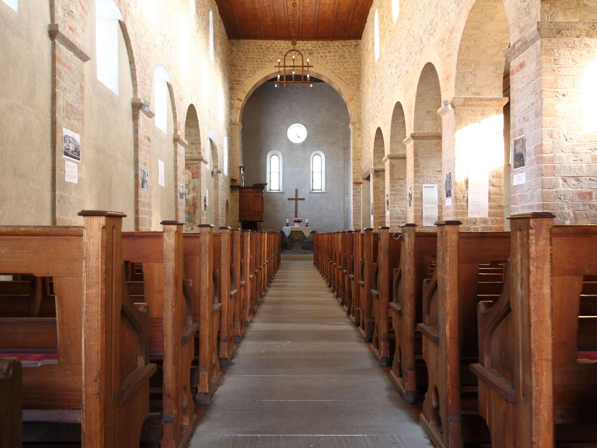 Die Kirche ist eine dreischiffige, romanische Basilika im lombardischen Stil. Das nördliche Seitenschiff wurde, durch den Einfluss des nahen Rheins baufällig und um 1600 abgerissen. Von der Malerei des 13. Jahrhunderts ist diejenige am Triumphbogen erhalten. Die Fresken der heiligen Agatha (Nordwand), des heiligen Sebastian (Chor) und des heiligen Antonius und Benedikt (Seitenapsis) entstanden nach 1500, der Taufstein 1512. Die Kanzel datiert aus dem 17. Jahrhundert.