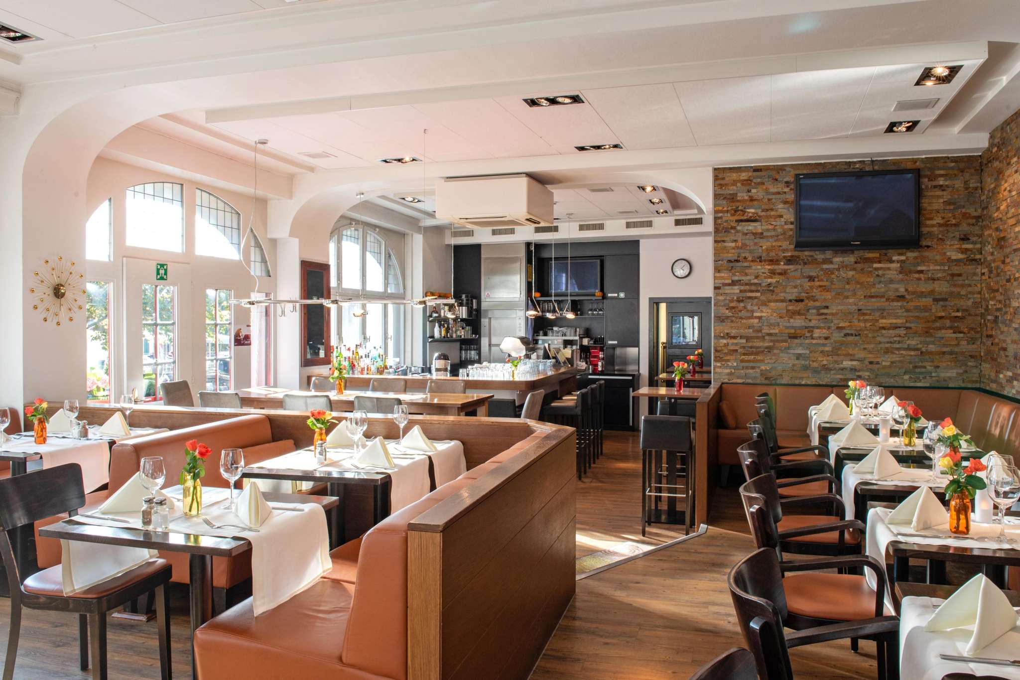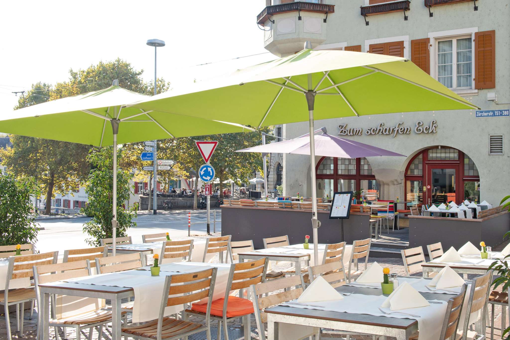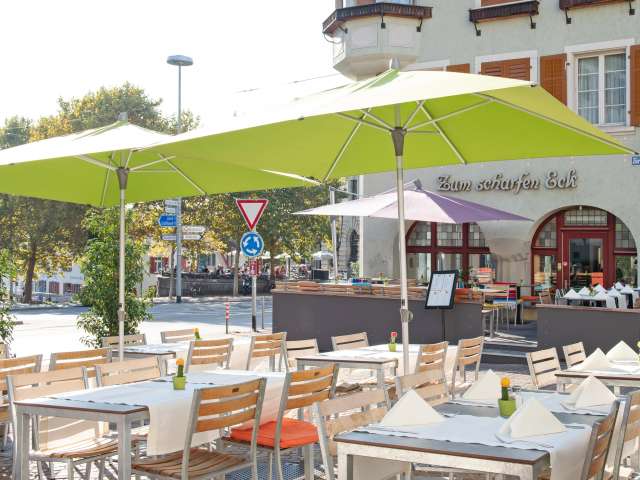 Die einladende Bar und die grosszügige Sonnenterrasse bieten morgens die Möglichkeit, bei Kaffee & Gipfeli die aktuellen Tageszeitungen oder verschiedene Zeitschriften zu lesen. Nachmittags ist das Scharfe Eck ein beliebter Treffpunkt für einen Apéro, ein erfrischendes Eis oder den entspannten Feierabend.