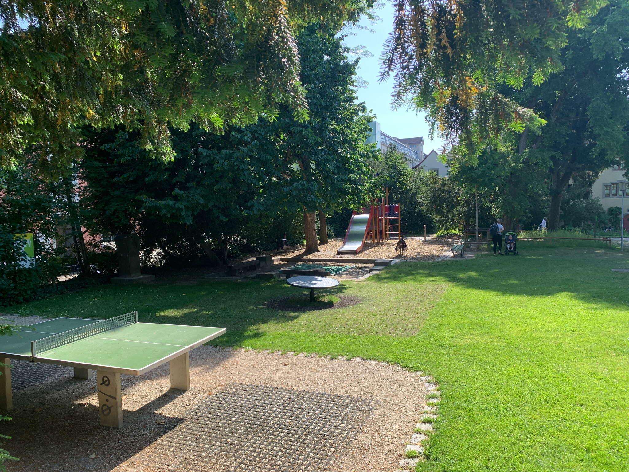 Schaukel, ein Sandkasten und ein Ping Pong Tisch laden zum Spielen und sich