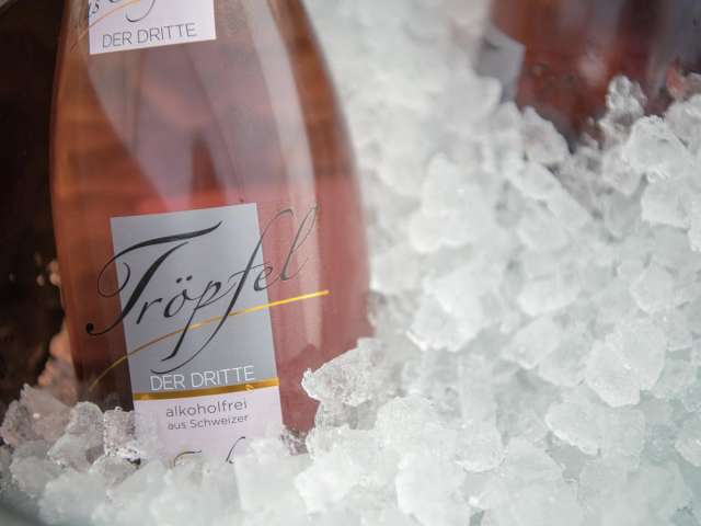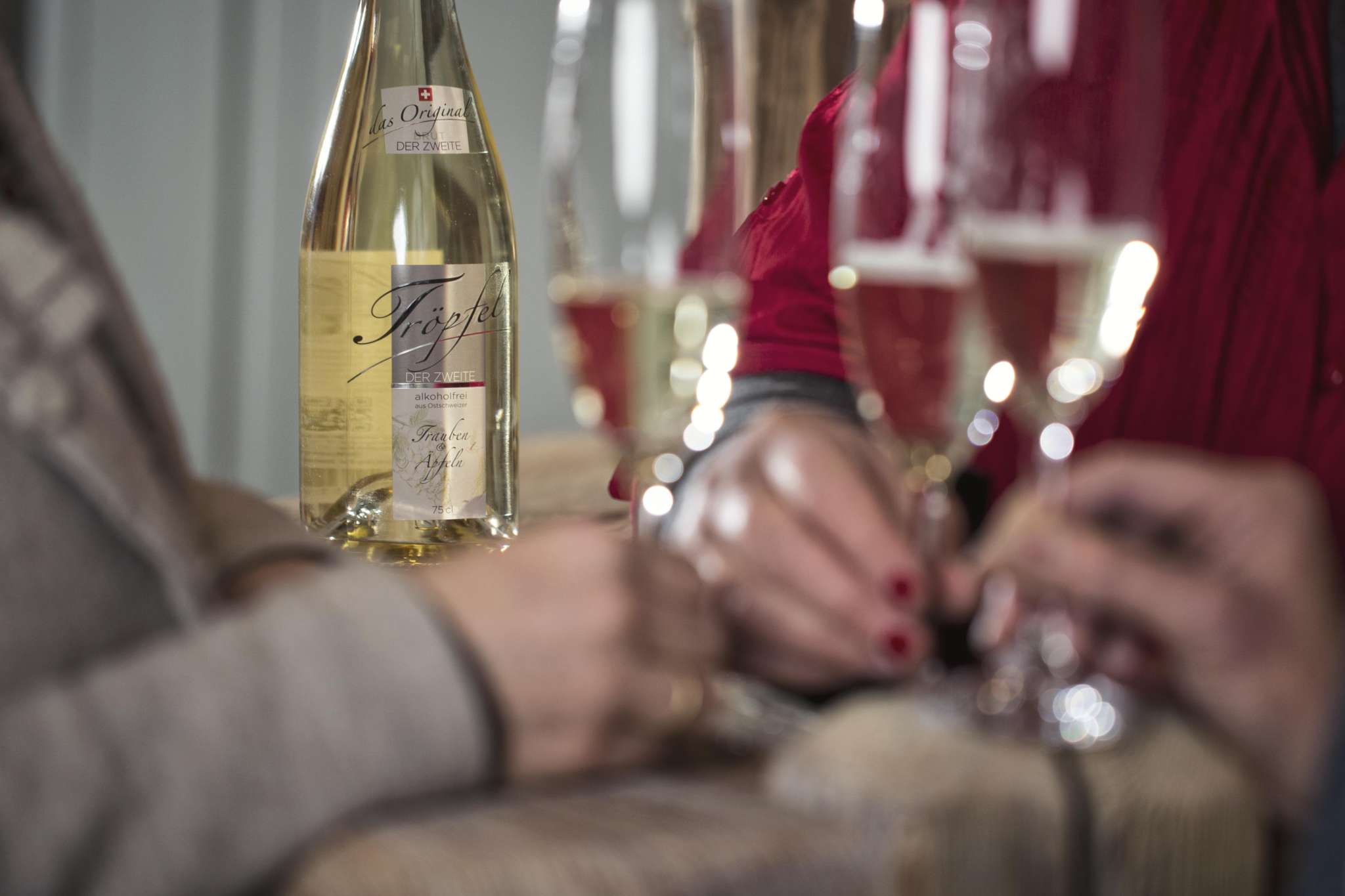 Tröpfel, der alkoholfreie Schaumwein aus Schweizer Trauben und Äpfeln, schmeichelt Gaumen und – Leber. Die verschiedenen nullprozentigen Geschmacksrichtungen sind ausserordentlich erfrischend, prickelnd und passen zu jedem Anlass. Auch das isotonische Paes oder der Sansbulle ohne Kohlensäure überraschen.