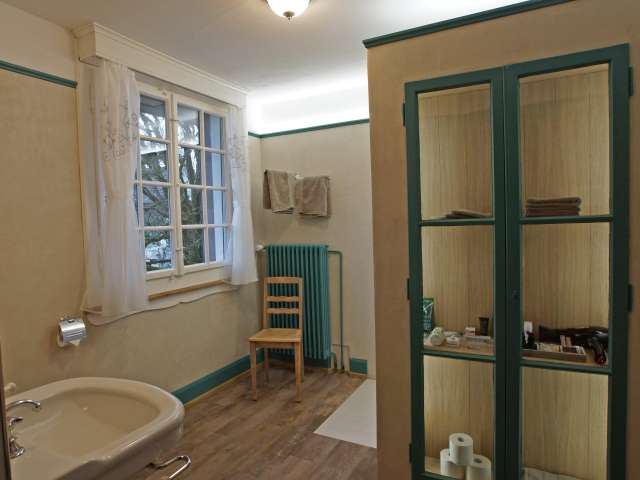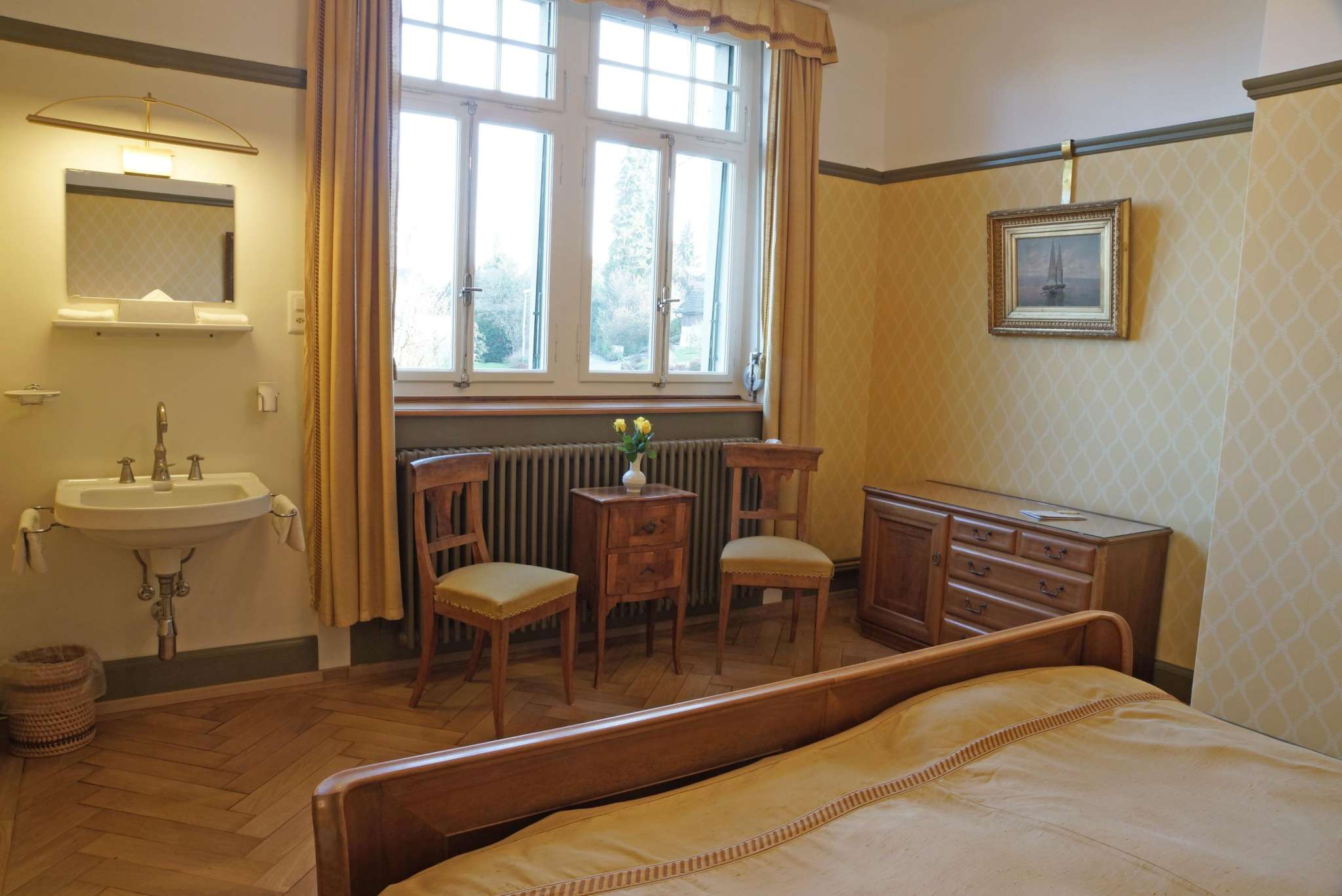 Der Charme der denkmalgeschützten Villa überzeugt: Nostalgische Möbel, Jugendstillavabos und antike Fliesen sorgen für das entsprechende Ambiente. Die Unterkunft in Aadorf ist für bis zu vier Personen ausgelegt, Babybett und Kinderbett sind zusätzlich vorhanden. Ein Park zum Ausruhen oder Entdecken (Kinderfreundlich), eine Bibliothek sowie ein Flipperkasten runden das Angebot ab. Mit hausgemachten Brötchen aus dem Holzofen startet man gut in den Tag. Die Region kann zu Fuss oder mit dem Velo entdeckt werden. Ein Besuch der umliegende Städte und Museen im Dreieck Winterthur-Frauenfeld-Wil lohnt sich ebenfalls. Auch der Rheinfall, der Bodensee oder das Toggenburg sind nur 30 Autominuten entfernt, 2 kostenlose Parkplätze sind vorhanden. Der Bahnhof ist nur 3 Gehminuten entfernt, mit guten ÖV-Verbindungen Richtung Zürich oder St. Gallen.