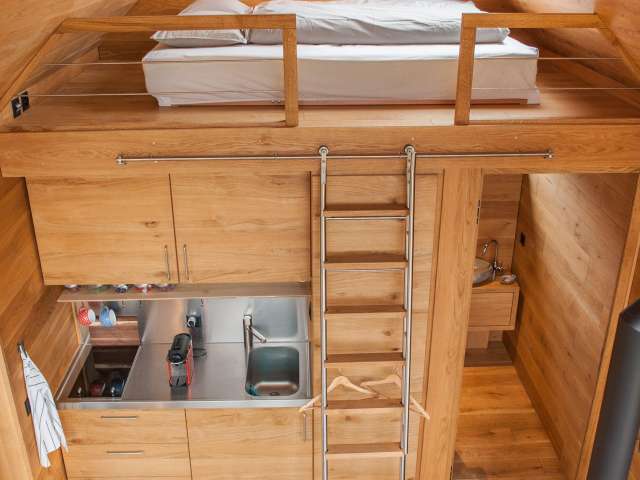 Der einzigartige Rückzugs-Ort in den Bäumen bietet eine wunderschöne Aussicht auf das Flusstal der Thur und die typischen alten Thurgauer Apfelbäume. Auf 23 m² findet man modernen Komfort und stilvoll-schlichtes Ambiente. Das Baumhaus ist mit allem Notwendigen ausgestattet: Dusche, WC, Doppelbett, kleine Küche mit Kühlschrank, Kaminofen und Terrasse.