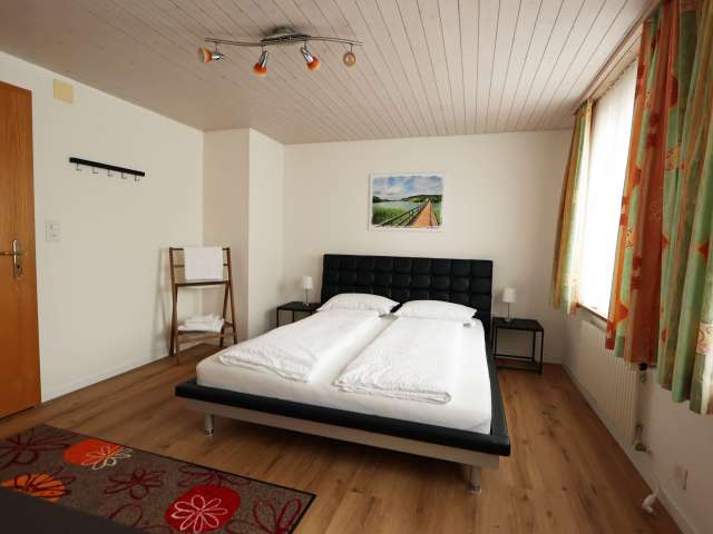 Mehrere moderne Zimmer stehen zur Verfügung, die sich ein Gemeinschaftsbad und eine separate Toilette teilen. Ein gemütlicher Aufenthaltsraum lädt zum Verweilen ein, zudem gibt es einen überdachten Parkplatz sowie eine Einstellhalle für Zweiräder mit Ladestation.