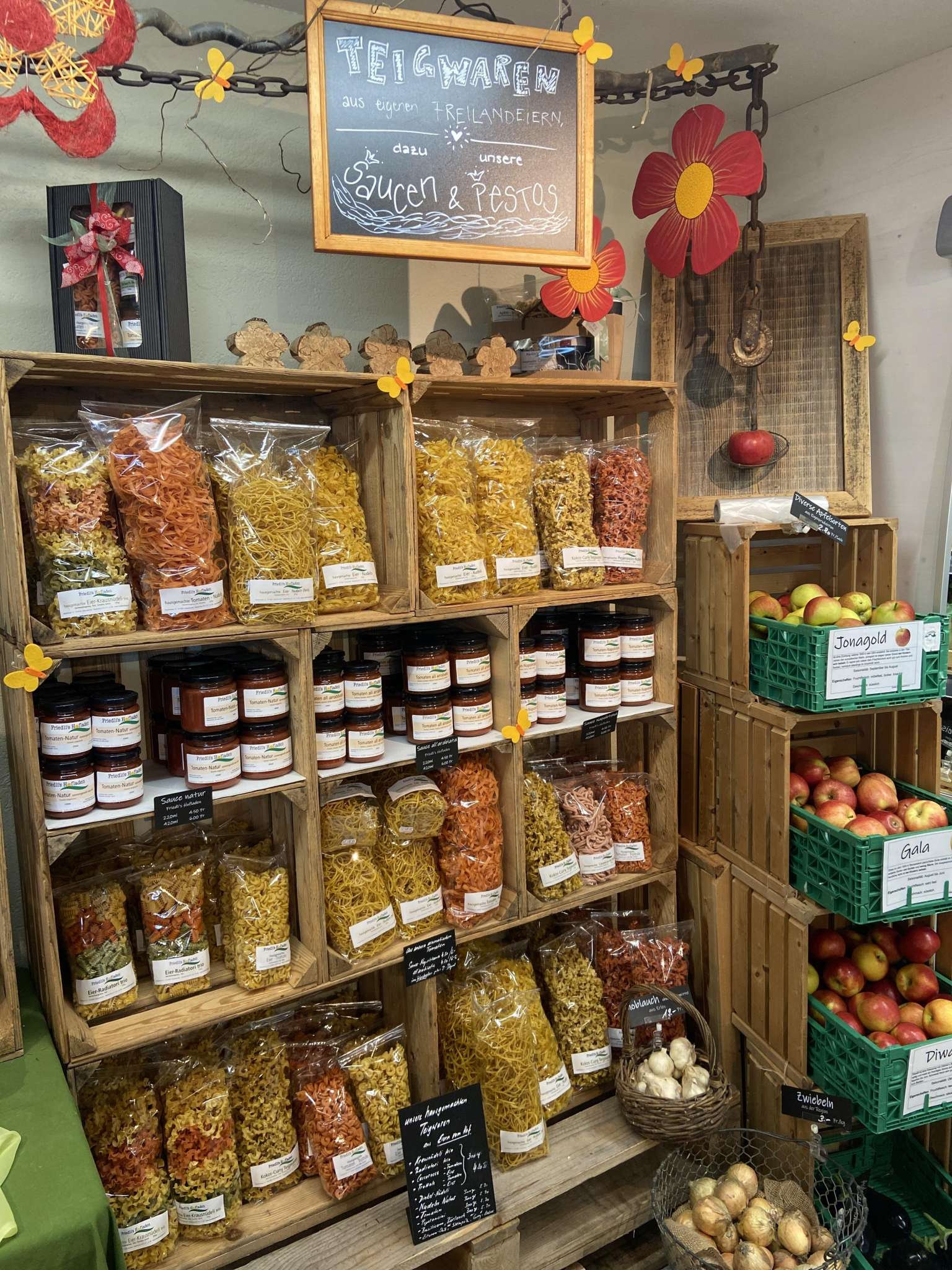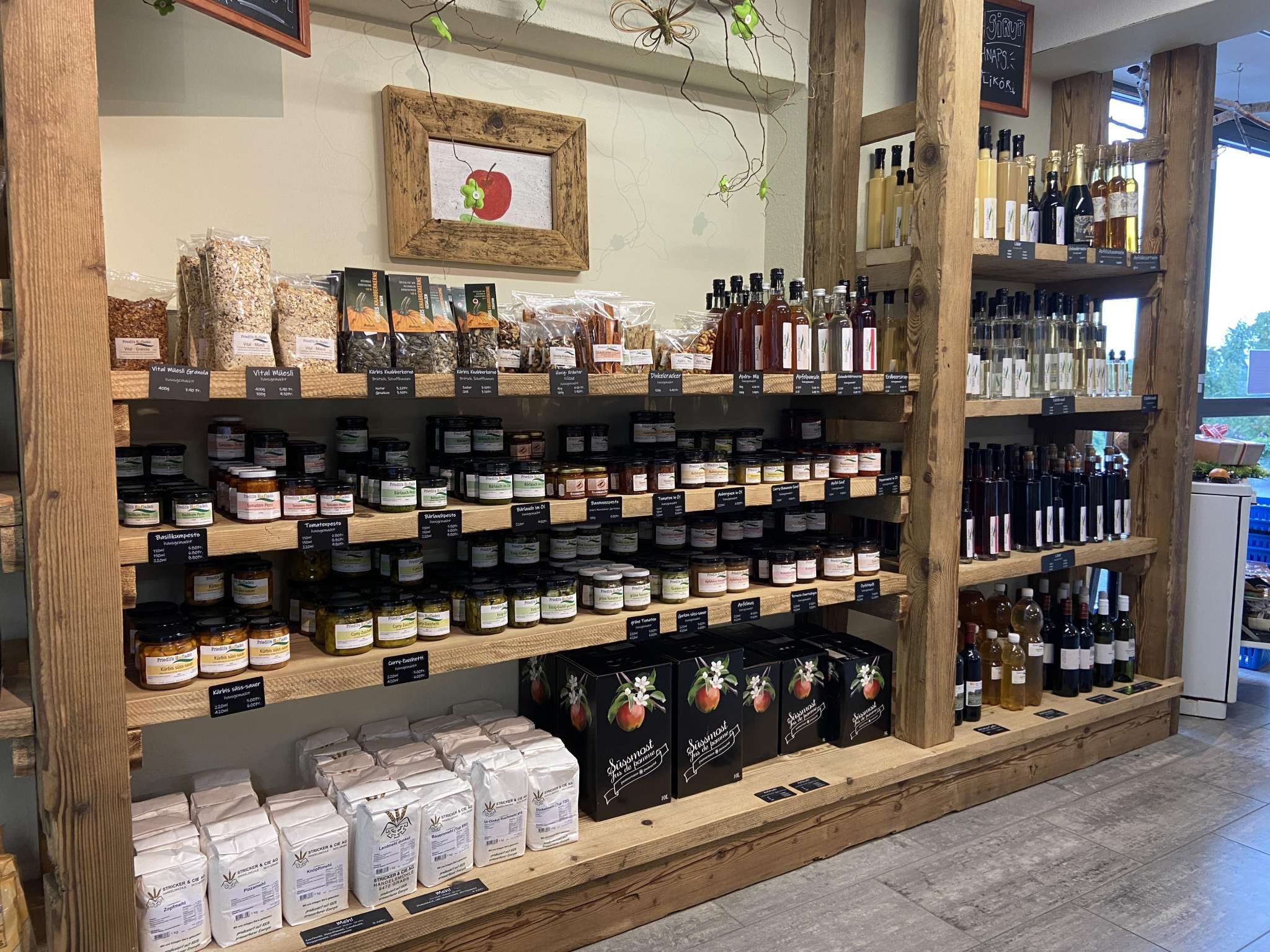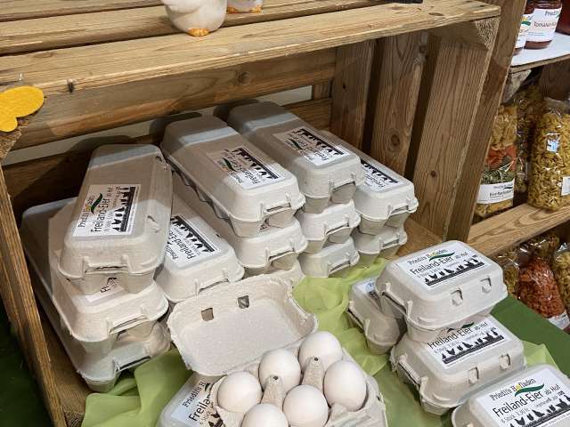 Viele feine auserlesene Spezialitäten aus hofeigenen Produkten wie zB. Eingemachtes, Eingelegtes, Konfitüren, Sirup, Trockenfrüchte, Pestos, Saucen, Joghurts sowie verschiedene Dips, Salatsaucen, Spätzli, Kartoffelsalat, Suppen. Natürlich alles ohne jegliche Zusatzstoffe