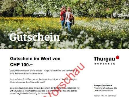 Die Nachfrage nach Gutscheinen, die als Geschenk oder Dankeschön für Mitarbeiter, Freunde oder andere Gruppen online gekauft und an verschiedenen Orten eingelöst werden können, steigt in der aktuellen Zeit stark an. Mit dem Thurgau-Gutschein entfällt die Qual der Wahl: Der Inhaber des Gutscheins wählt sein persönliches Thurgau-Erlebnis aus und kann den Gutschein bei rund 100 touristischen Betrieben im Thurgau einlösen. Die beteiligten Betriebe sind hier aufgeführt.