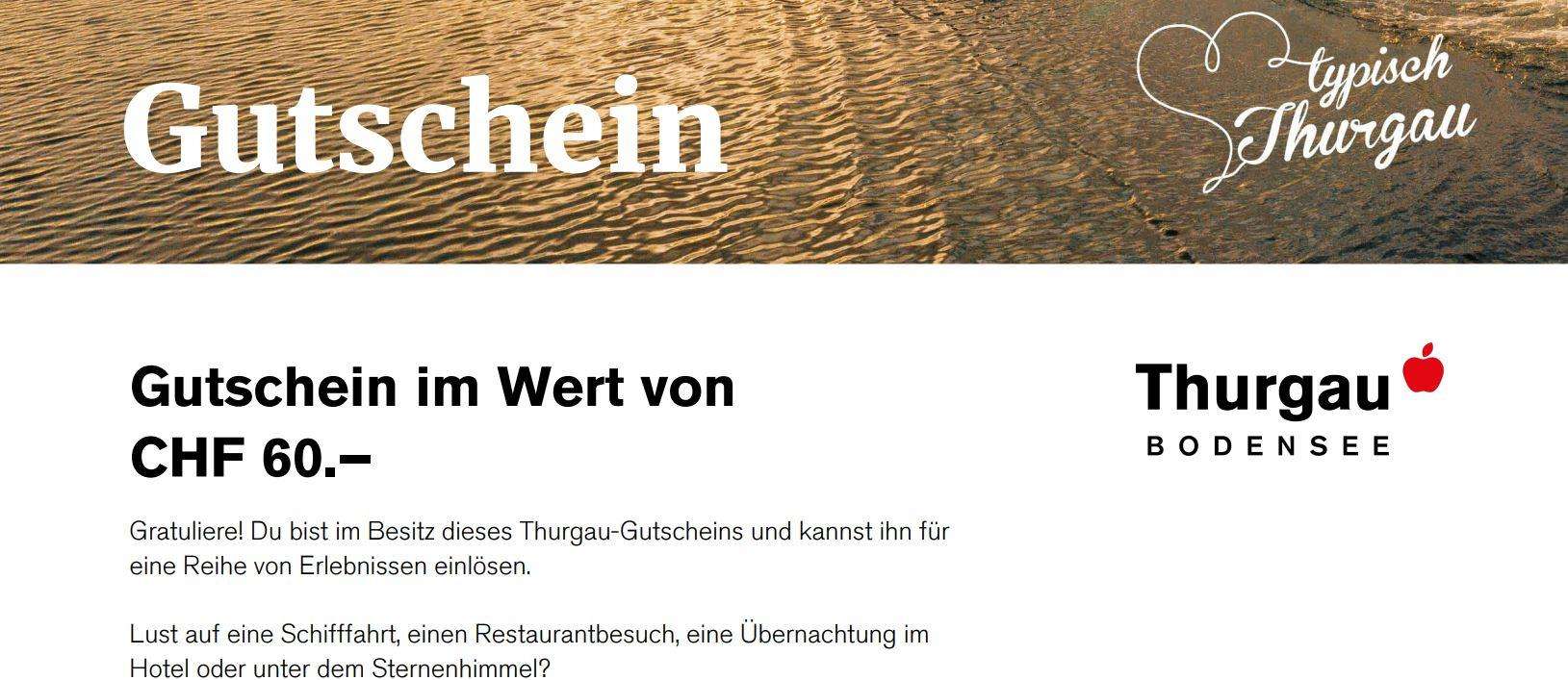 Das Verschenken von Gutscheinen wird immer beliebter. Der Schenkende steht jedoch oft vor der Frage, welcher Gutschein es denn sein soll. Der Thurgau-Gutschein liefert die passende Antwort. Dieser Gutschein ist frei wählbar und kann bei allen teilnehmenden Gastronomie- und Freizeitbetrieben im ganzen Kanton Thurgau eingelöst werden. Wie es im Detail funktioniert, lesen Sie hier.