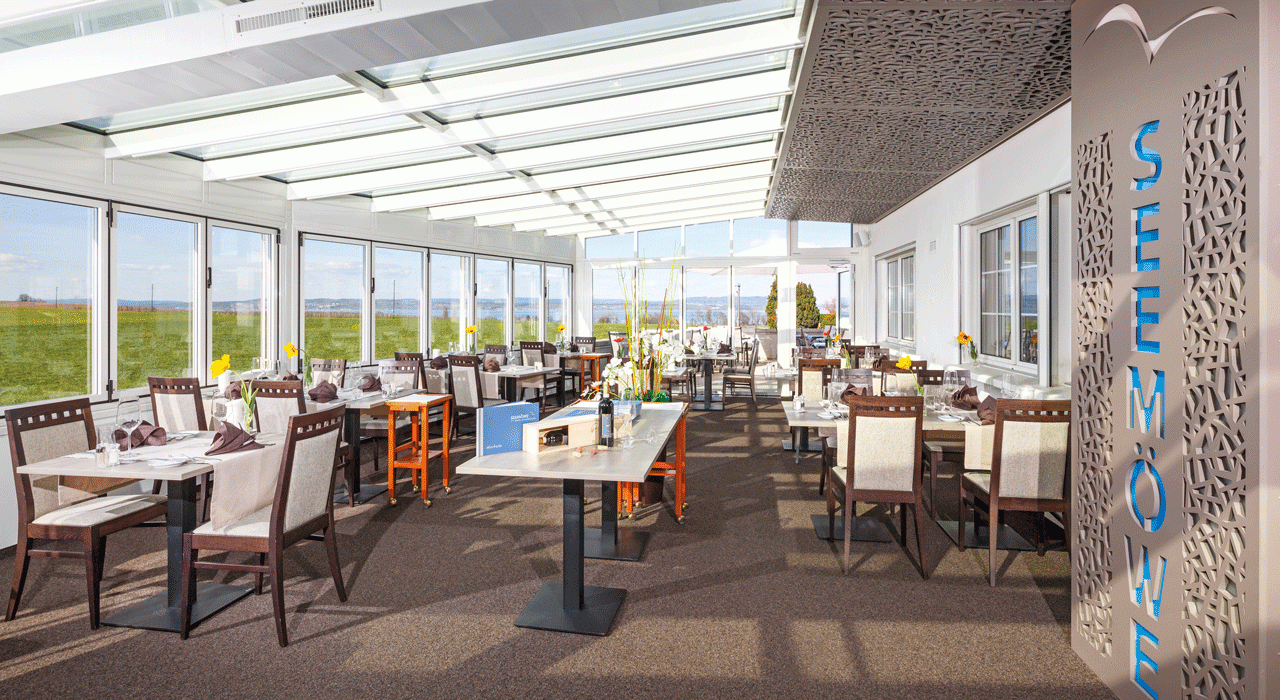 Das Restaurant des Hotels Seemöwe, auf einem Hügel gelegen und mit beeindruckendem Weitblick auf Wiesen und den Bodensee, überzeugt mit seinem vielfältigen Angebot. Dank grossem Bankettsaal und gepflegter Gartenanlage ist die Seemöwe auch für Gesellschaften die richtige Wahl.
