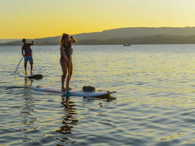 Es gibt kaum einen schöneren Weg den Bodensee mit seiner einzigartigen Natur- und Kulturlandschaft zu entdecken als paddelnd vom Wasser aus. La Canoa, das Kanuzentrum in Konstanz, rüstet Wasserbegeisterte aus mit Paddel-Equipment und bietet ein vielfältiges Kursangebot und Routenvorschläge. Wie wäre es zum Beispiel beim Aufenthalt am Bodensee bis zur Unterkunft mit dem Kanu zu paddeln? Oder den Bodensee-Kanuweg unter die Ruder zu nehmen? 25 Abgabestationen rund um den Bodensee machen diese etwas andere Art des Reisens möglich. Auf Schweizer Bodenseeseite finden sich SUP- und Kanustationen in Romanshorn, Kreuzlingen, Gottlieben, Steckborn, Stein a.R., Schaffhausen. Hier können Boote und SUP's gemietet und abgegeben werden. Für Gruppen-, Schulklassen-, Firmen- und Teambuildingausflüge bietet La Canoa geführte Kanutouren an. Das gemeinsame Fortbewegen auf dem Wasser stärkt den Zusammenhalt, denn nur mit vereinten Kräften gelangt man ans Ziel. Ein spritziger und erlebnisreicher Tag ist garantiert.
