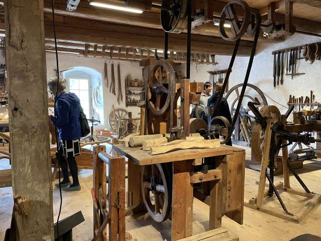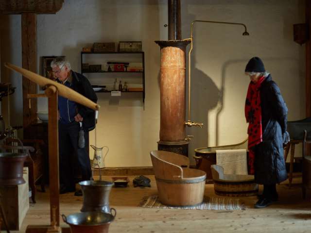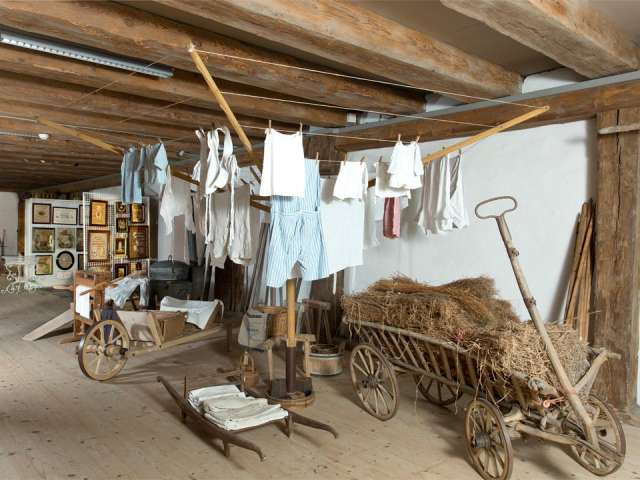Im Kornhaus des ehemaligen Dominikanerinnenklosters wird eine überwältigende Vielfalt von über 10'000 Objekten ausgestellt. Auf eindrückliche Weise werden Besuchende hier Zeuge der Lebens- und Arbeitsweise zu Urgrossmutters Zeit. Auf 2'700 Quadratmetern heisst es Eintauchen in die Welt unserer Vorfahren. Was bewegte Pferdebesitzer dazu, ein Stück graviertes Hirschgeweih an ihr Fuhrwerk zu hängen? Weshalb wurde ein Scherenmotiv in einen Dachziegel gedrückt? Auf geführten Touren erfahren Besuchende faszinierende Geschichten aus einer Zeit ohne Rasenroboter, Induktionsherd und Mobiltelefon. Darüber hinaus bestaunen sie auch das grösste historische Holzfass der Schweiz, ein 45'000 Liter-Gigant von 1759 aus Mostindien.